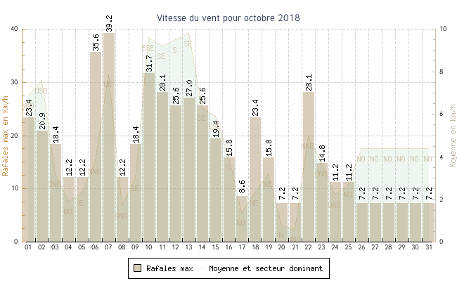 | min | max | moy | Vitesse (rafales) | Secteur | ||
